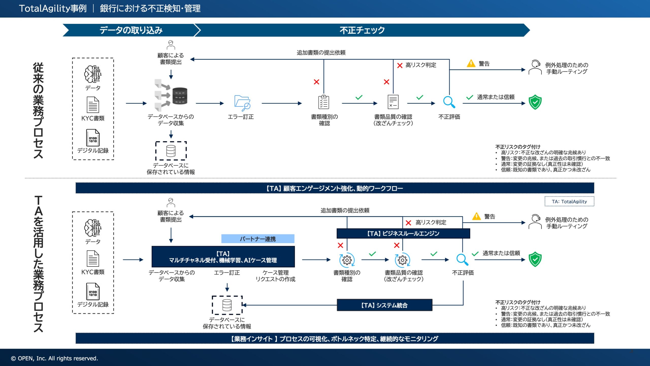 TotalAgility の AI/機械学習(ML)、ドキュメント AI(書類改ざん検知)、ケース管理、動的ワークフローを組み合わせることで、検知から調査、タスク割り当て、当局報告までを単一プラットフォーム上で統合管理します。